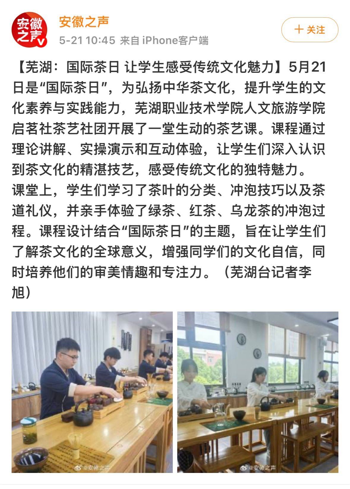课上,芜湖市茶艺协会会长、芜湖职业技术学院副教授杨阳老师深入浅出地讲解茶文化的渊远历史、茶的分类、茶道礼仪及茶叶冲泡技巧等,让同学们在“一片叶子”中领略到中华文明的深厚传承。学生们除了汲取丰富的茶知识滋养更亲手体验了绿茶、红茶、乌龙茶的冲泡过程。活动因其浓郁的传统文化氛围及浸润式的育人模式被“安徽之声”“芜湖新闻综合广播”等多家当地媒体聚焦报道。