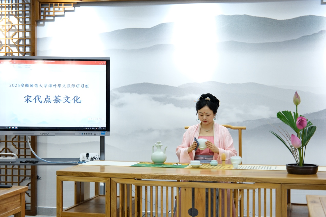 来自越南的范氏宝燕老师说:“中国十大名茶,安徽独占其三。何其有幸,不仅细品了茶道之美,啜饮了祁门红茶的醇厚,更亲手体验了宋代点茶。那一刻,我深深感受到安徽人对茶的那份执着与自豪以及安徽师长们的温润热情。茶烟袅袅间,仿佛看见千年风雅在杯中流转,一方水土的灵韵,尽化于此盏之中。”