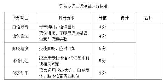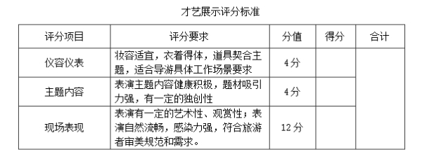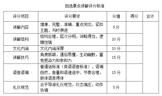 导游英语口语测试、自选景点讲解、才艺展示评分标准见附件。