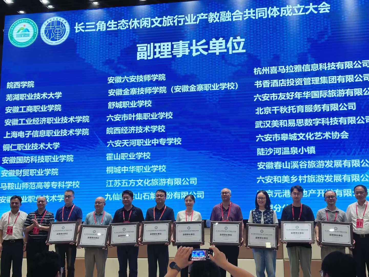 7月19日,安徽大别山职业教育集团2025年年会暨长三角生态休闲文旅行业产教融合共同体成立大会在六安职业技术学院召开,来自长三角地区的文旅企业、行业组织、职业院校等180余家单位齐聚一堂,共商产教融合大计。人文旅游学院院长孙蔚闻、旅游管理专业带头人魏军及教研室主任朱福军应邀参会。
