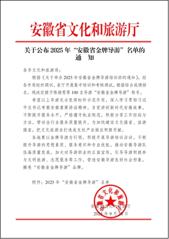 近日,安徽省文化和旅游厅正式印发《关于公布2025 年“安徽省金牌导游”名单的通知》,其中,我校人文旅游学院翟伟老师凭借扎实的专业素养与优异表现成功入选。