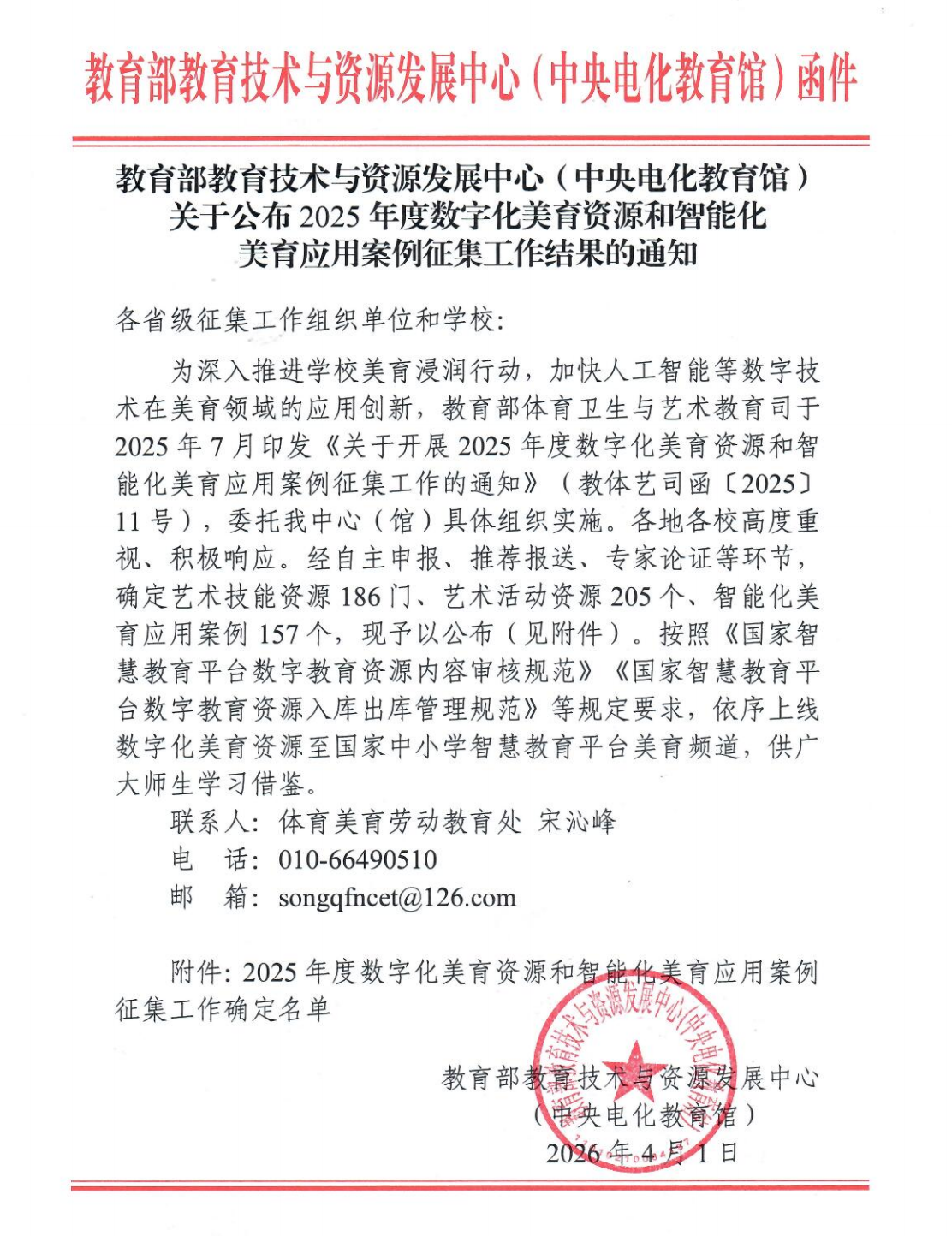 近日,教育部教育技术与资源发展中心(中央电化教育馆)正式公布2025年度数字化美育资源和智能化美育应用案例征集工作结果,我校报送的五幕原创话剧《山河守望的黎明》成功入选“艺术活动资源”类别。