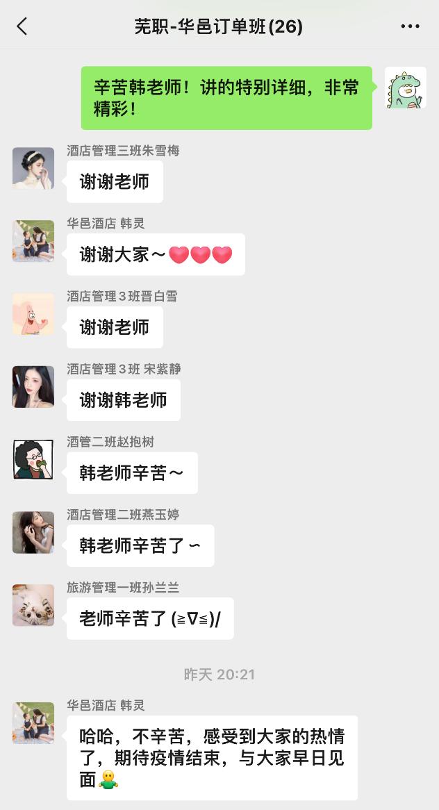 因疫情防控需要,本次订单班课程采取线上教学形式,由芜湖华邑酒店培训部副经理韩灵和芜湖希尔顿逸林酒店的培训部经理郝乐分别为订单班学生做主题为《真正待客之道——诚挚态度》和《希尔顿企业管理文化》的岗位培训。培训课上,两位企业导师从企业经营实际出发,突出专业技能和职业素养培养,授课内容生动活泼、案例丰富、亮点纷呈,同学们认真聆听课程内容,积极参与课堂讨论,始终保持浓厚的学习兴趣,教学成效十分明显。
