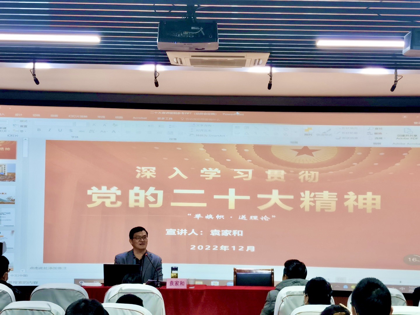 袁家和紧扣二十大报告核心内容,围绕党的二十大主题、党和国家事业取得的历史性成就和发生的历史性变革、马克思主义中国化时代化、中国式现代化、全面建设社会主义现代化国家的目标任务、坚持党的全面领导和全面从严治党、应对风险挑战等方面,对党的二十大精神作了讲解和阐释。